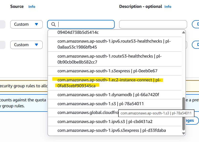 - Note:- This prefix list contains the IP address ranges that AWS manages for the EC2 Instance Connect service. When you connect through the EC2 console using Instance Connect, the traffic originates from these AWS-managed IP addresses